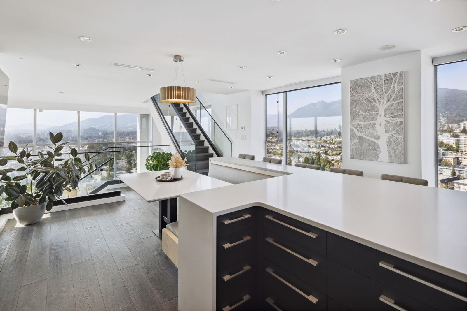 Indulge in unparalleled luxury with this penthouse at the Observatory. Floor-to-ceiling windows offer sweeping city and harbour views. This extensively renovated 2328 SF home spans four levels and features over 1500 SF of outdoor terraces. Highlights include a gourmet kitchen with a butler’s pantry, 12-foot ceilings, custom built-ins throughout, and four private outdoor spaces. The layout has two bedrooms on lower level and a top-floor master suite with a walk-in closet and spa-like en-suite. Enjoy vibrant Lower Lonsdale living with shops, restaurants, and entertainment at your doorstep. Includes 3 parking spots, ample storage, plus stunning gardens, a fitness centre, and a pool—it’s like living in a resort!
